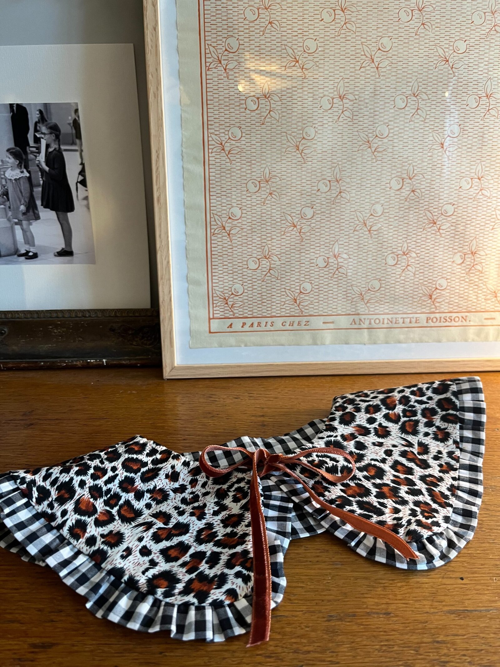 Colette léopard est un col amovible au caractère affirmé. Ce maxi col claudine associe un motif léopard aux tons terre à un vichy noir et blanc, le tout souligné par un délicat volant froncé en vichy. Il se noue à l’aide d’un ruban en velours assorti et offre l’avantage d’être réversible : côté léopard ou côté vichy, à vous de choisir votre style du jour.