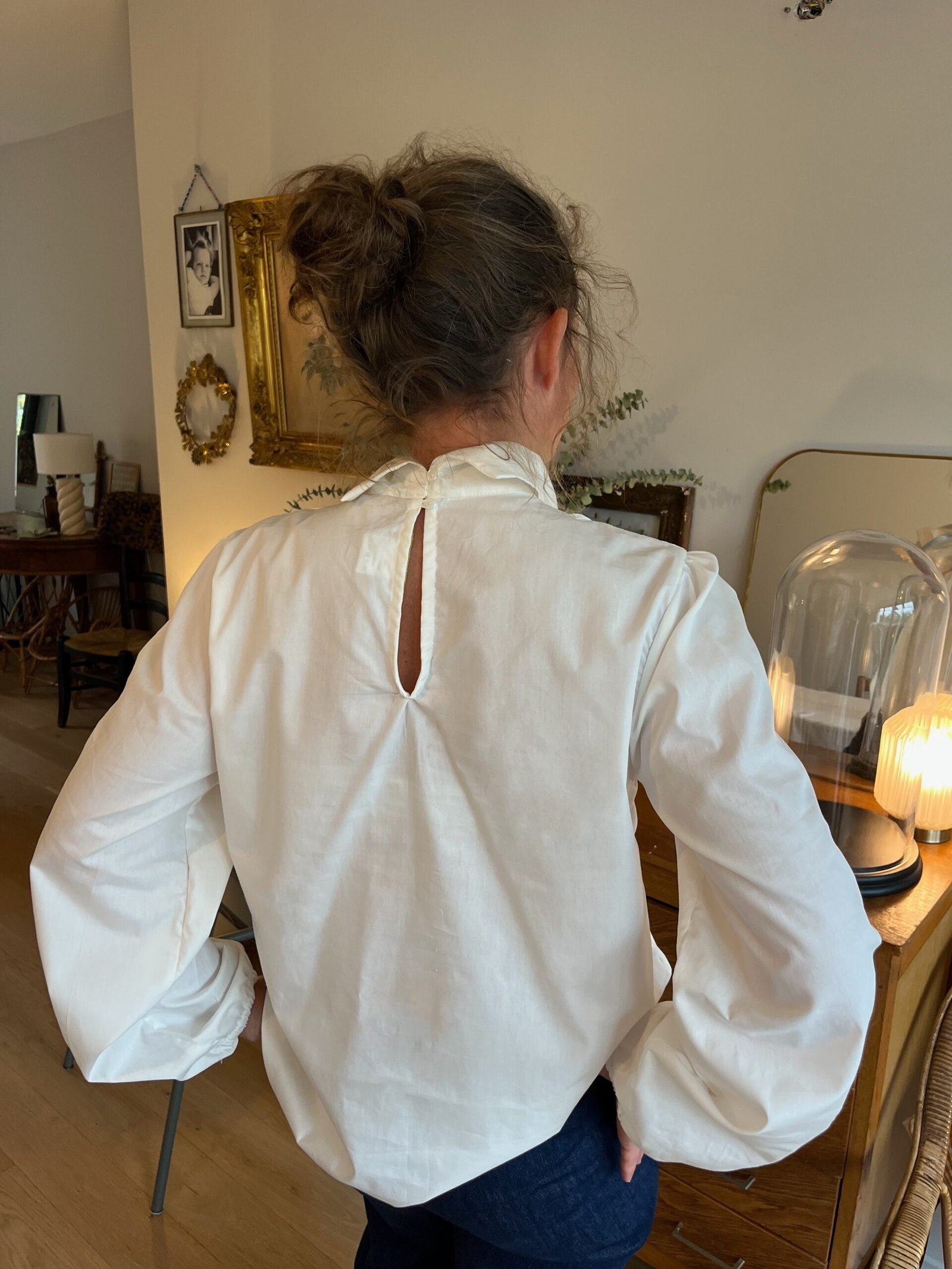 Henriette est une blouse délicate mise en valeur par un large nœud ton sur ton. Elle présente des manches longues légèrement bouffantes, resserrées aux poignets, et son nœud — à porter devant ou sur le côté, en pans longs ou courts — offre différentes façons de la styliser.
