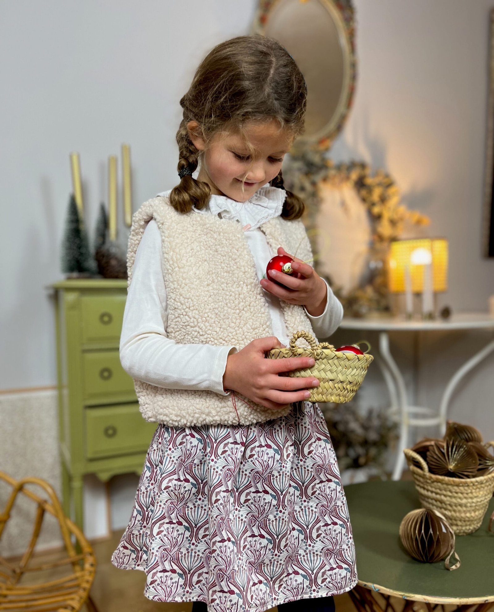 Découvrez Léontine, la jupe courte en liberty vintage qui se porte avec style été comme hiver. Son design pratique avec une ceinture élastiquée offre un confort optimal, tandis qu’un joli nœud en gros grain bordeaux ajoute une touche de charme unique.